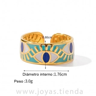 Anillo ojo turco. Composición de acero inoxidable chapado en oro de 18 quilates. Anillo abierto ajustable.