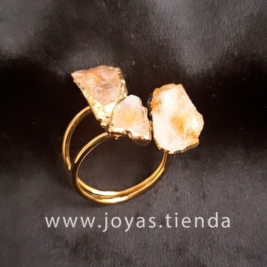 Anillo ajustable de latón con piedras naturales (cuarzo y cuarzo citrino) bañado en oro de 14k. Cada anillo es único, depende del tamaño y la forma de las piedras.