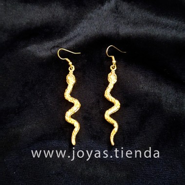 Pendientes Serpiente Cascabel Dorada Dibujo en latón bañada en oro de 14 quilates.