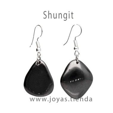 Pendientes Rodados Shungit, piedra natural famosa por sus múltiples propiedades procedente de Shunga, Karelia, Rusia. La base es de latón con un baño de plata.
