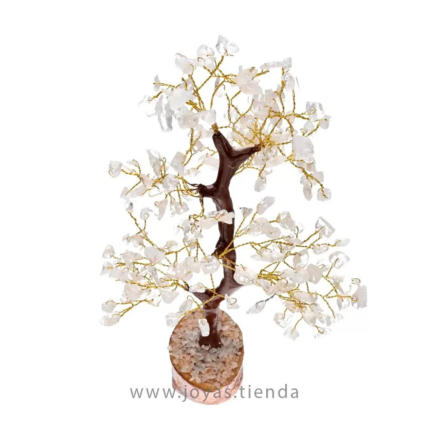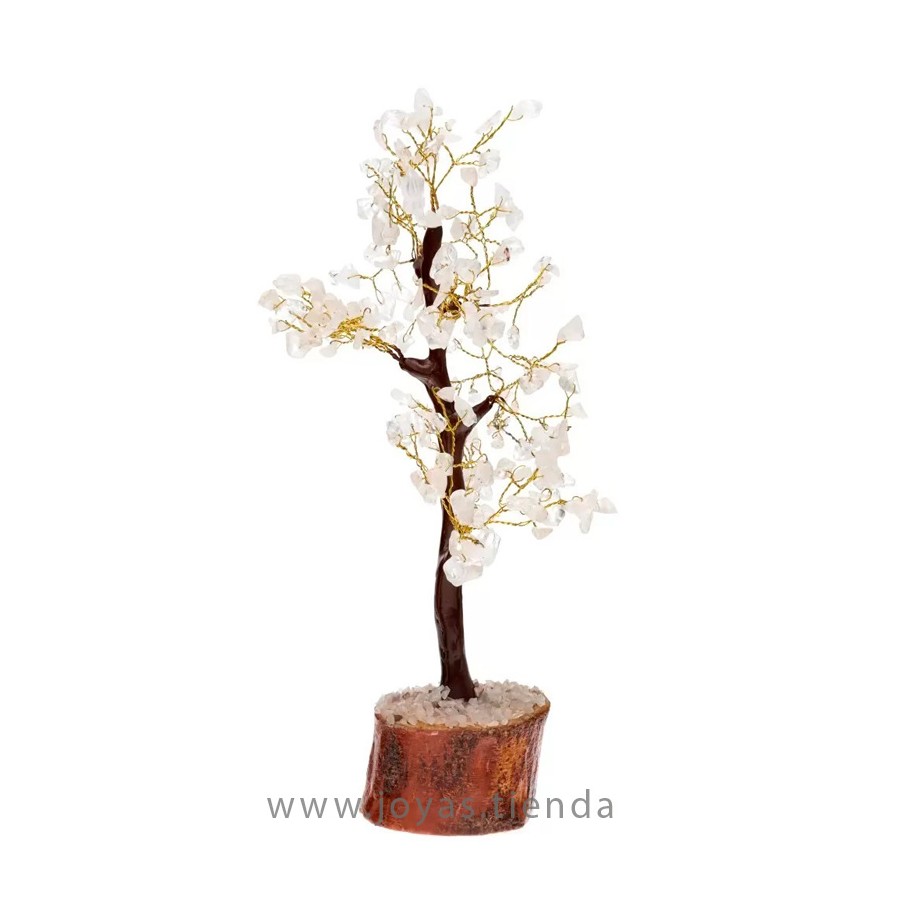 Árbol de Cuarzo Blanco. Árbol de cuarzo con base de madera. Arbolito de piedras naturales auténticas, en la parte inferior madera. Procedente de Brasil.
