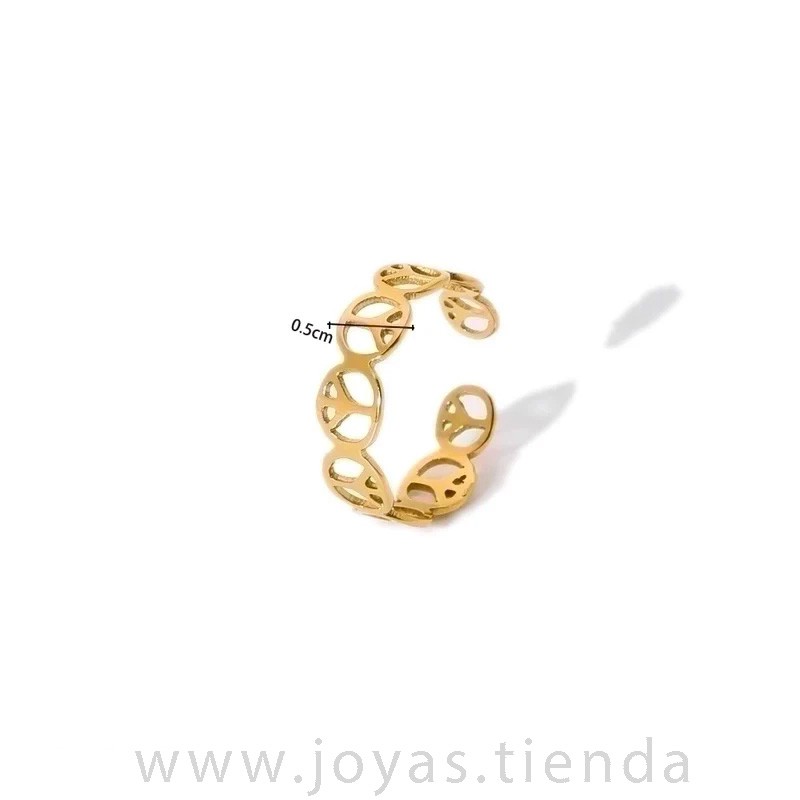 Anillo símbolo de la paz entrelazado. Composición de acero inoxidable chapado en oro de 14 quilates. Anillo abierto ajustable.