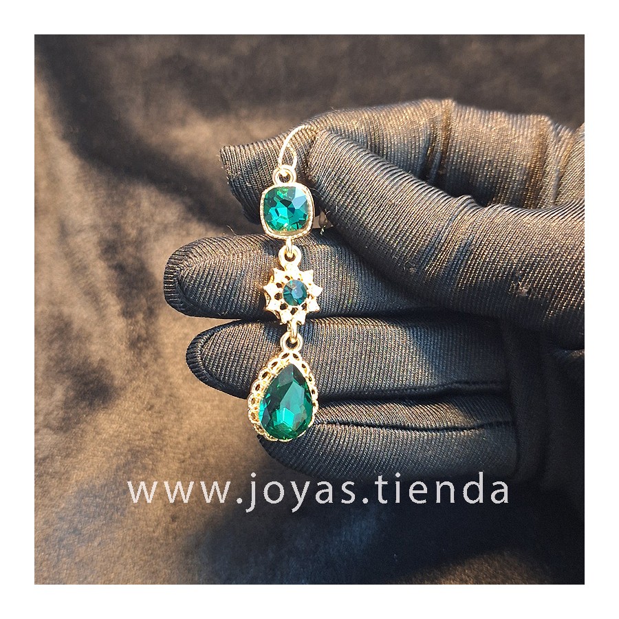 Pendientes verdes con tres formas geométricas. Composición de aleación de metal y circonitas.