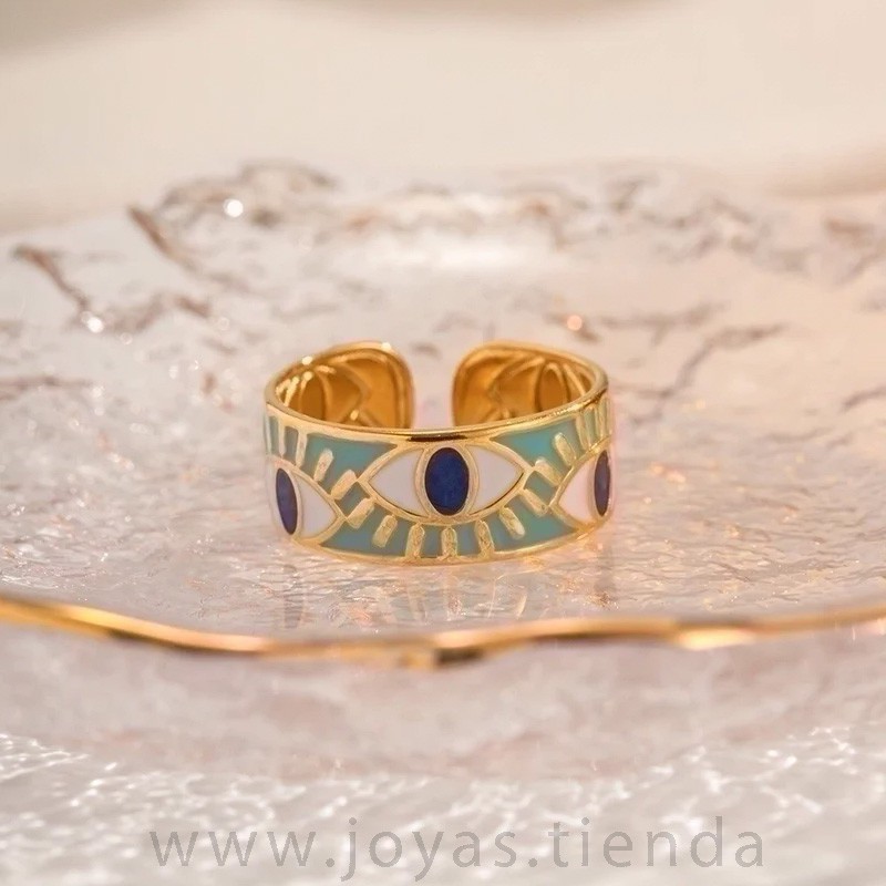 Anillo ojo turco. Composición de acero inoxidable chapado en oro de 18 quilates. Anillo abierto ajustable.