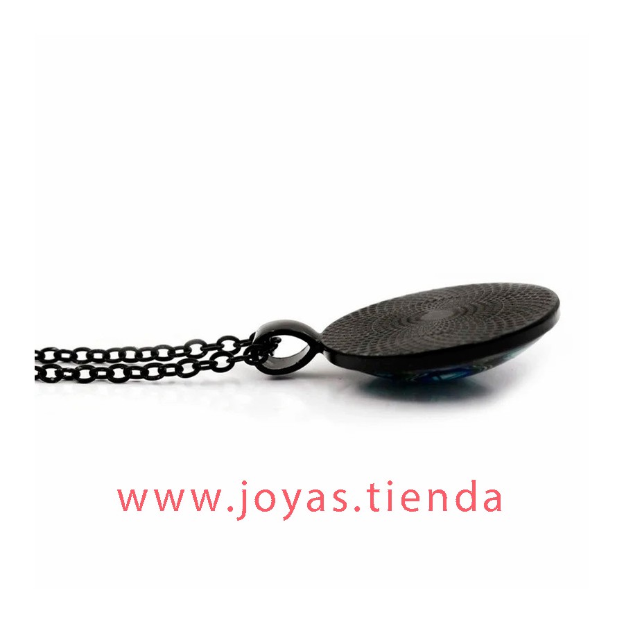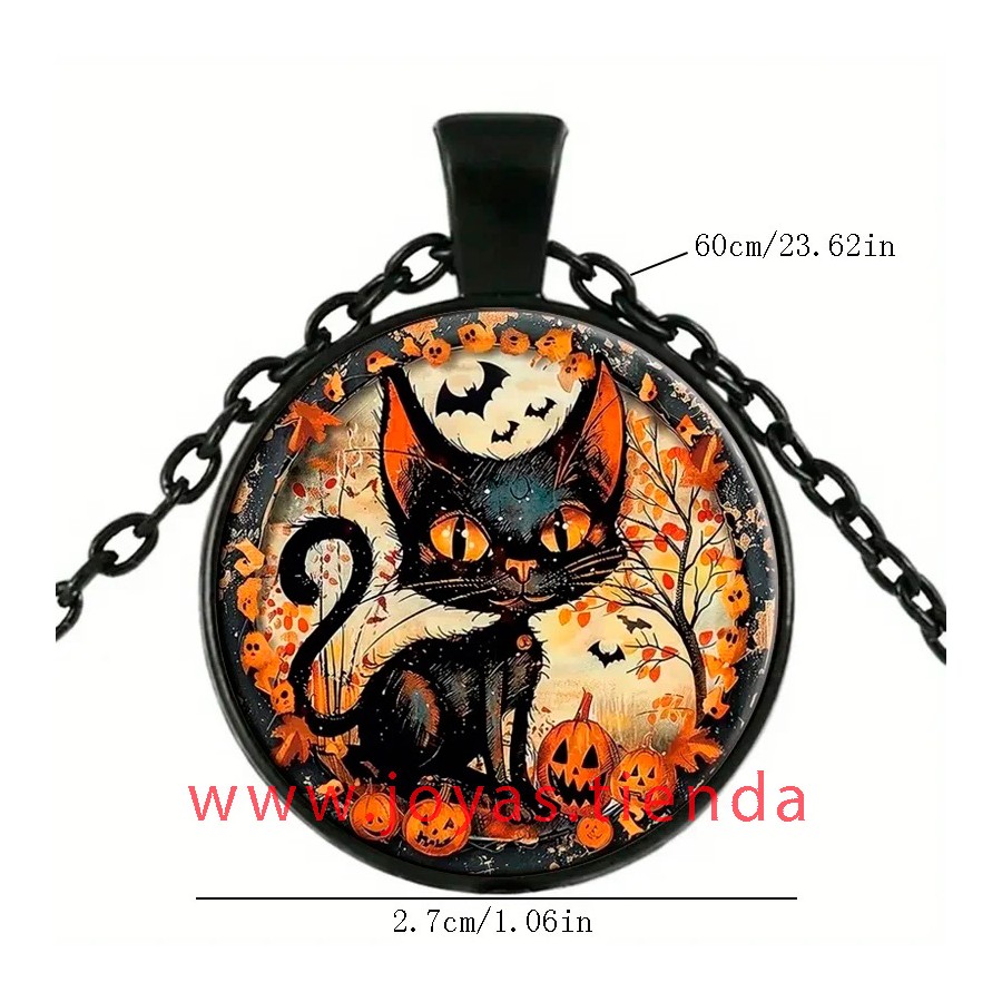 Colgante Gato Halloween. Colgante redondo estilo punk con imagen de gato en un fondo de murciélagos ideal para el mes de octubre. Disfruta de un look halloween durante tu noche de brujas añadiendo el detalle de éste colgante a la vez terrorífico y misterioso.