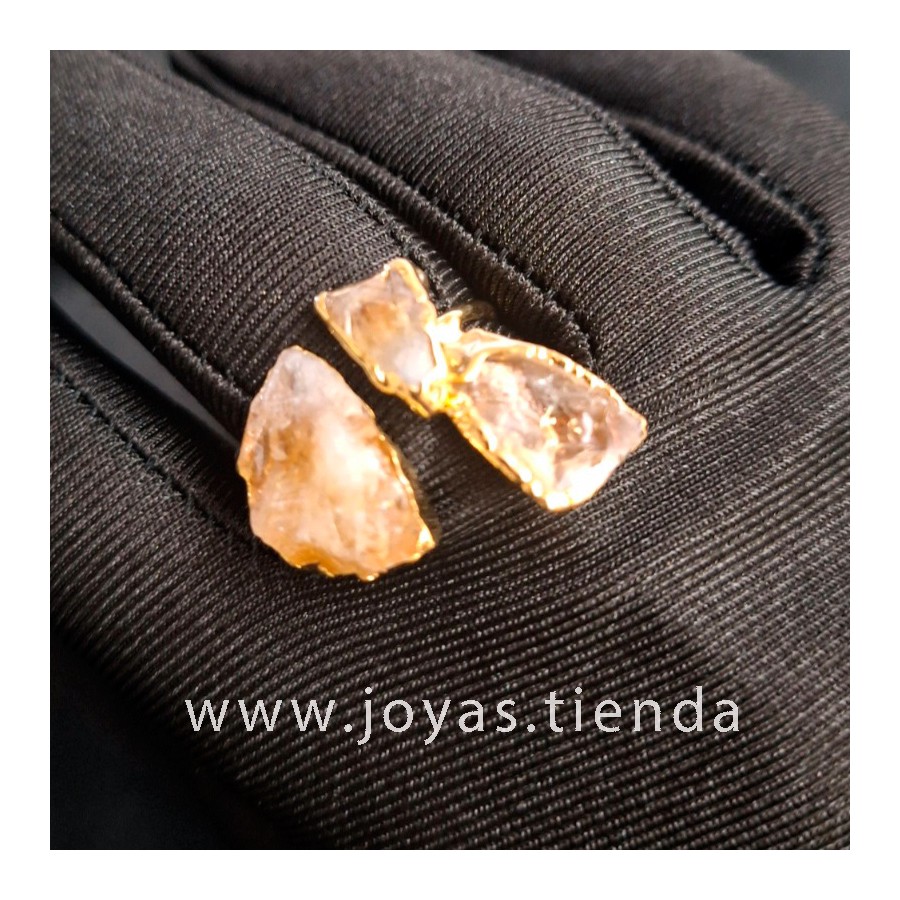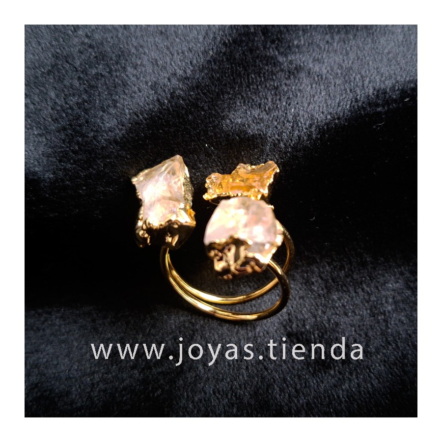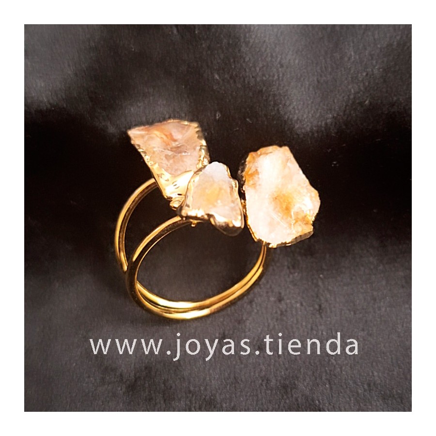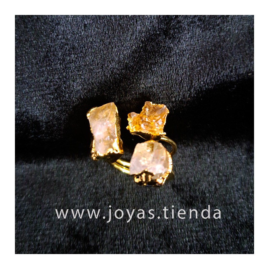 Anillo ajustable de latón con piedras naturales (cuarzo y cuarzo citrino) bañado en oro de 14k. Cada anillo es único, depende del tamaño y la forma de las piedras.