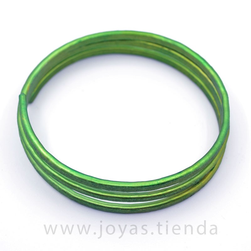 Pulsera artesanal hecha de aluminio en forma de espiral de color verde.