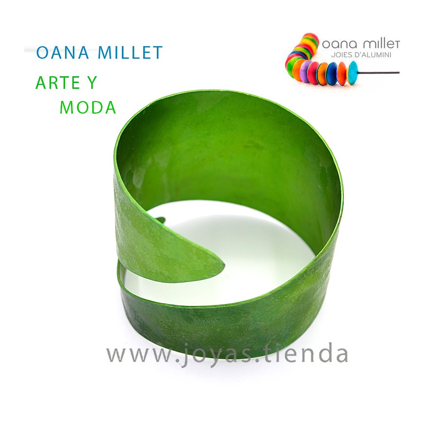 Pulsera Ancha Logos Verde diseñada por Oana Millet. Pulsera artesanal hecha de aluminio de color verde intenso satinado. Pulsera de diseño, pulsera de moda de la mano de Oana Millet. Anchura 5 cm aproximadamente, diámetro 6 cm. Ajustable.