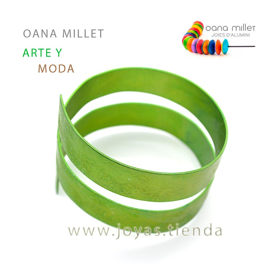 Pulsera Ancha Arco Verde diseñada por Oana Millet. Pulsera artesanal hecha de aluminio de color verde. Pulsera de diseño, pulsera de moda de la mano de Oana Millet. Anchura 5 cm aproximadamente, diámetro 6 cm. Ajustable.