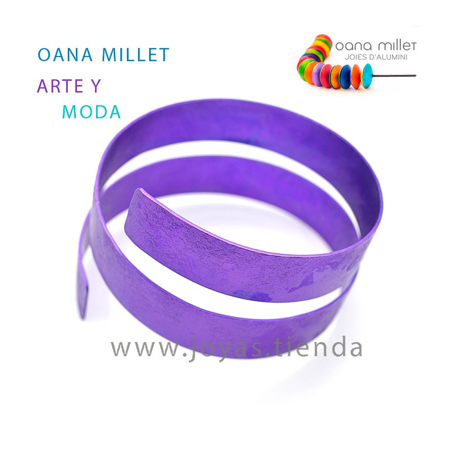Pulsera Ancha Arco Morada diseñada por Oana Millet. Pulsera artesanal hecha de aluminio de color morado. Pulsera de diseño, pulsera de moda de la mano de Oana Millet. Anchura 5 cm aproximadamente, diámetro 6 cm. Ajustable.