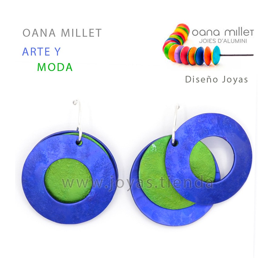 Pendientes Eterno Azul y Verde de Oana Millet. Pendientes artesanales hechos en aluminio y plata de ley con tres capas en colores azul y verde. (El color de las fotos de productos artesanales puede variar respecto al producto físico debido a factores como la iluminación, los perfiles de color, la edición de la imagen, los filtros y la pantalla de tu ordenador).