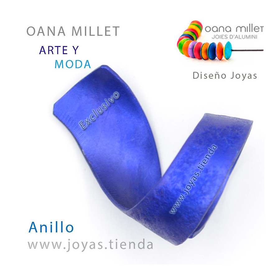 Anillo Evo Azul. Anillo hecho en aluminio en el color de la temporada de moda. La base del anillo está realizada en aluminio con una técnica cromática específica que le otorga ese color tan particular que sólo consigue Oana Millet.