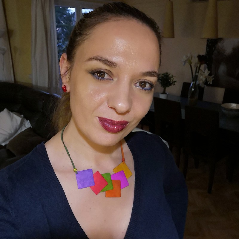 Collar artesanal hecho de aluminio multicolor con formas cuadradas. Colores lila, rojo verde, cobre, rosa y naranja.