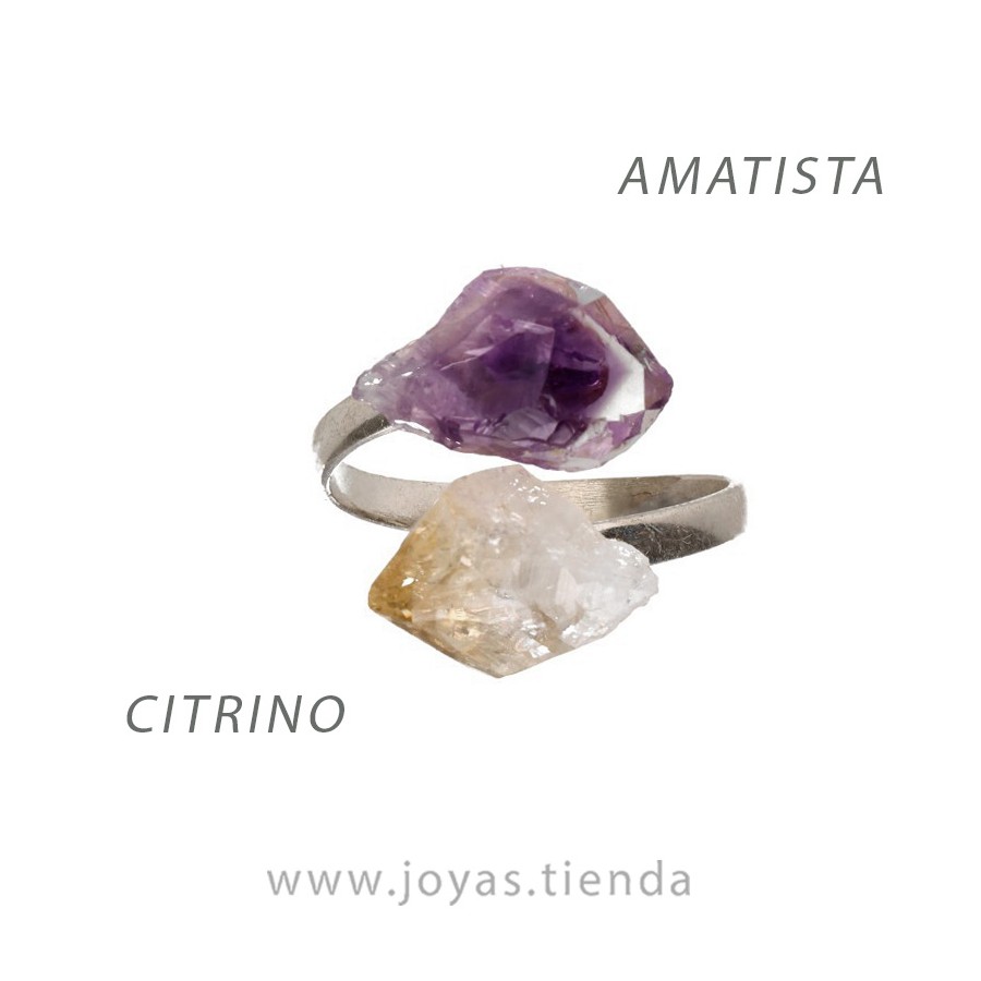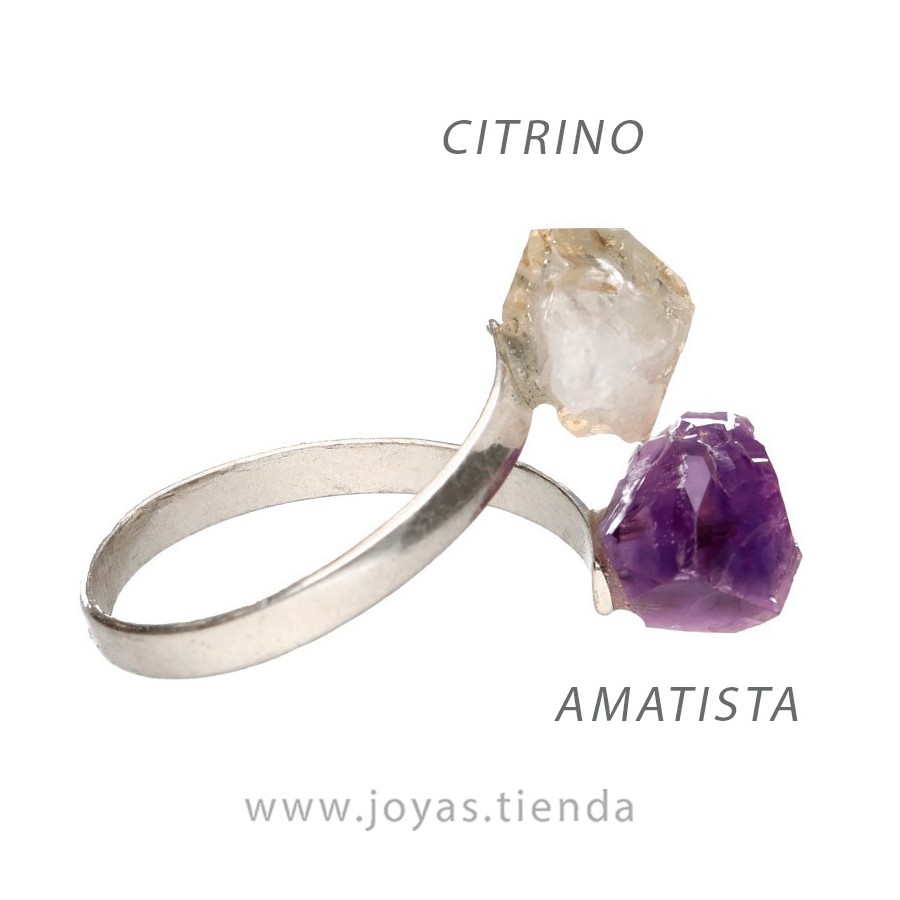 Anillo de Plata con Amatista y Citrino en Bruto. Las piezas que se entregarán son similares a las de las fotografías, son anillos con piedras naturales en bruto, sin pulir, cada piedra es exclusiva y tiene sus vértices.