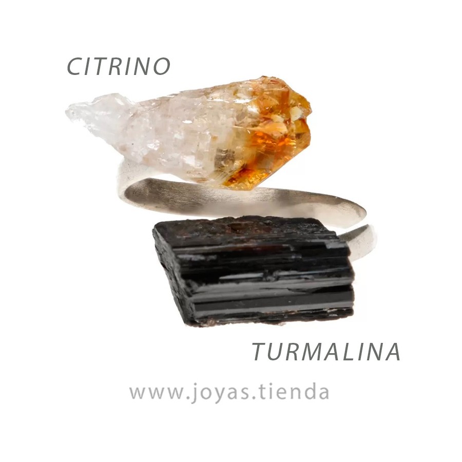 Anillo de Plata con Citrino y Turmalina en Bruto. Las piezas que se entregarán son similares a las de las fotografías, son anillos con piedras naturales en bruto, sin pulir, cada piedra es exclusiva y tiene sus vértices.