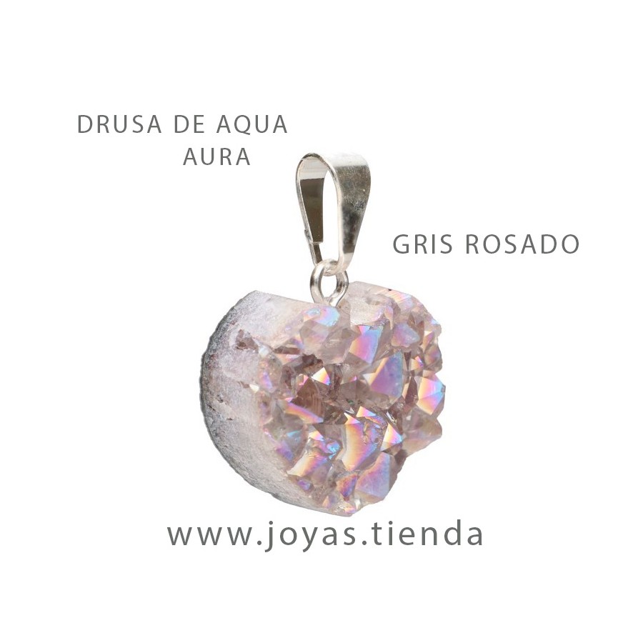 Colgante Corazón Drusa de Aqua Aura Gris Rosado, piedra natural con engarce baño de plata. Procedente de Brasil.