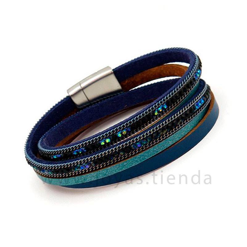 Pulsera Ailish de color azul. Hecha en piel y metal con adornos de abalorios. Libre de plomo, cadmio y níquel.